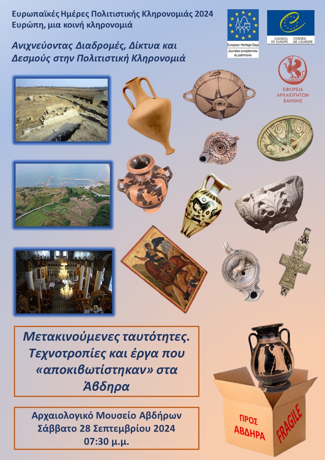 με αφορμή τον εορτασμό των Ευρωπαϊκών Ημερών Πολιτιστικής Κληρονομιάς 2024 (27 – 29 Σεπτεμβρίου 2024), η Εφορεία Αρχαιοτήτων Ξάνθης συμμετέχει στη φετινή δράση Ανιχνεύοντας Διαδρομές, Δίκτυα και Δεσμούς στην Πολιτιστική Κληρονομιά με την εκδήλωση "Μετακινούμενες ταυτότητες. Τεχνοτροπίες και έργα που «αποκιβωτίστηκαν» στα Άβδηρα" και σας καλεί σε ένα ιδιαίτερο "unboxing" στο Αρχαιολογικό Μουσείο Αβδήρων, το Σάββατο 28 Σεπτεμβρίου 2024 στις 7:30 μ.μ.