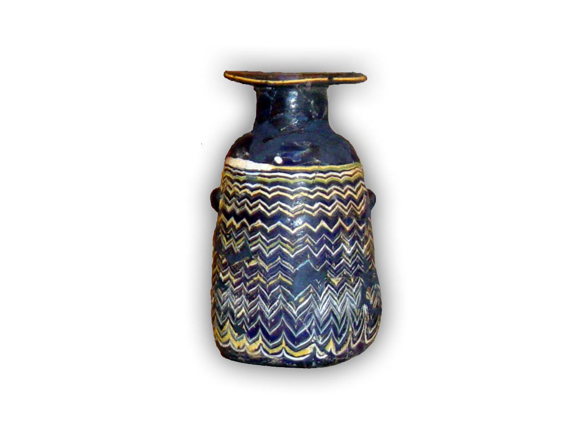 Αλάβαστρο από μπλε αδιαφανές γυαλί. Ανήκει σε μια σπάνια κατηγορία γυάλινων αλαβάστρων που έχουν επίπεδο πυθμένα. Η διακόσμησή του αποτελείται από επάλληλες ίνες γυαλιού σε χρώμα λευκό, κίτρινο και ανοιχτογάλαζο. Έχει ύψος: 9,5 εκ.